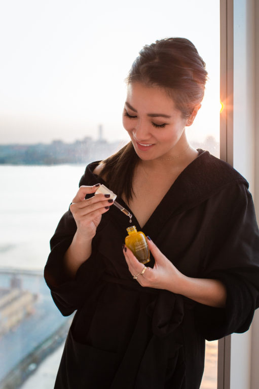 Step 4 :: I love serums, so this is my favorite part!  The Divine Youth Oil.  With just a few droplets, I massage it all over my face and neck.  It completely absorbs into my skin leaving it super soft and silky.  It’s lightweight and very hydrating.  It makes my skin glow, softens fine lines (especially around the mouth area), and hydrates my dry areas.  Also, if I want a dewy make-up look, I mix a drop of this facial oil with my foundation =)