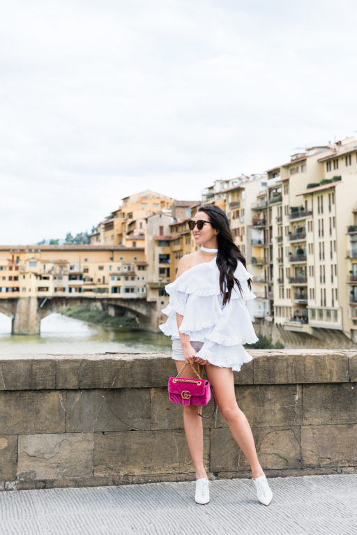 Pairing the feminine nature of the top with a sweet color, I coupled this off-shoulder piece with a lush rose colored bag (this is probably my favorite color from the Gucci GG Marmont collection!). I wanted the white and pink color combo to shine, so I kept the rest of the look streamlined in beige shorts and white mules.