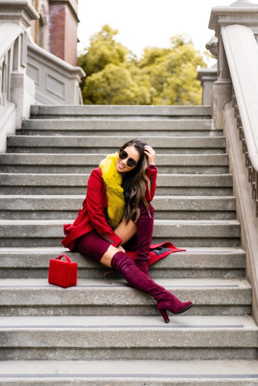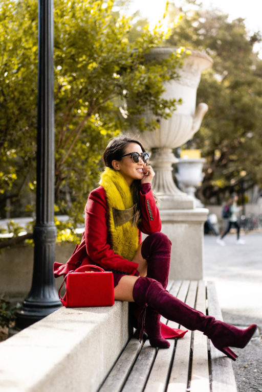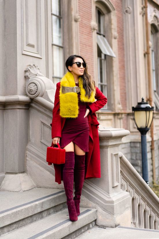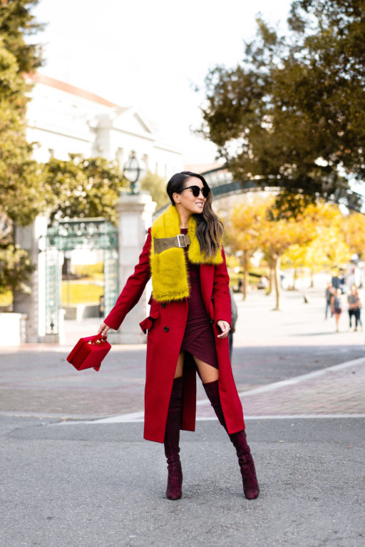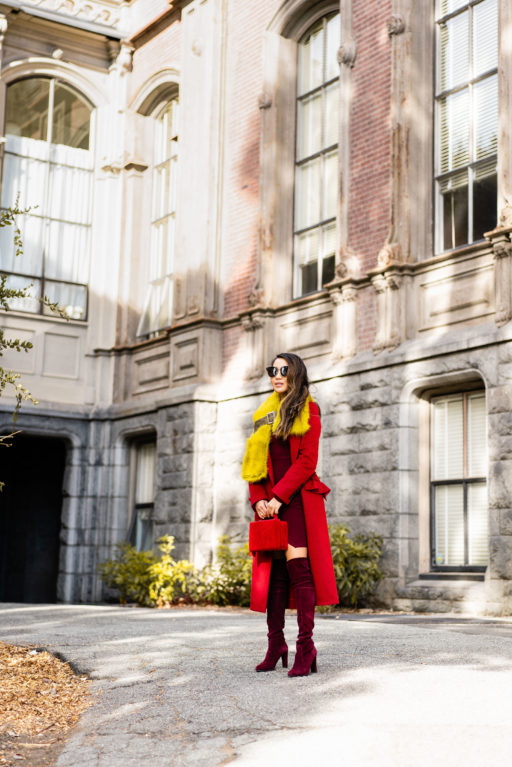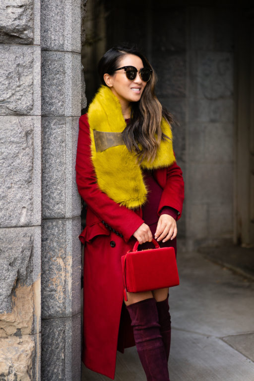 Breezy and chilly but not as cold as NYC, I mixed a palette of red, burgundy, and canary yellow with all of my favorite pieces.  I bought this red coat last winter and go back to it every time the temperature drops.  One of my favorite color pairings with red – yellow and burgundy.  It’s so stunning and striking!