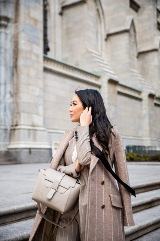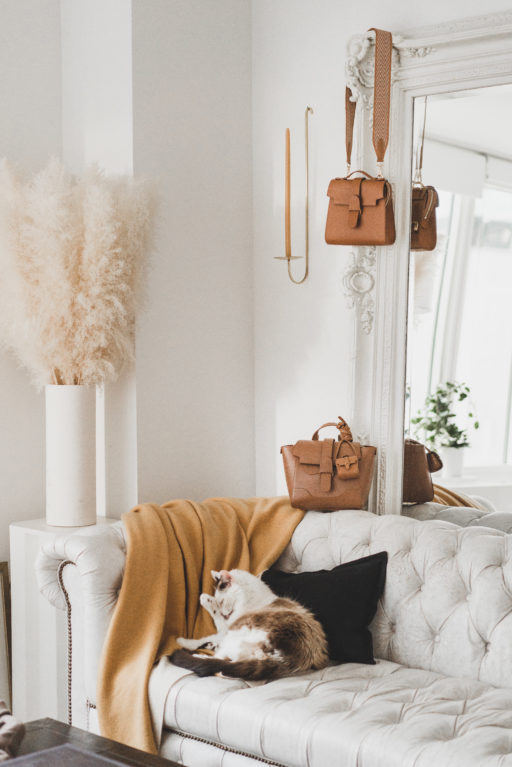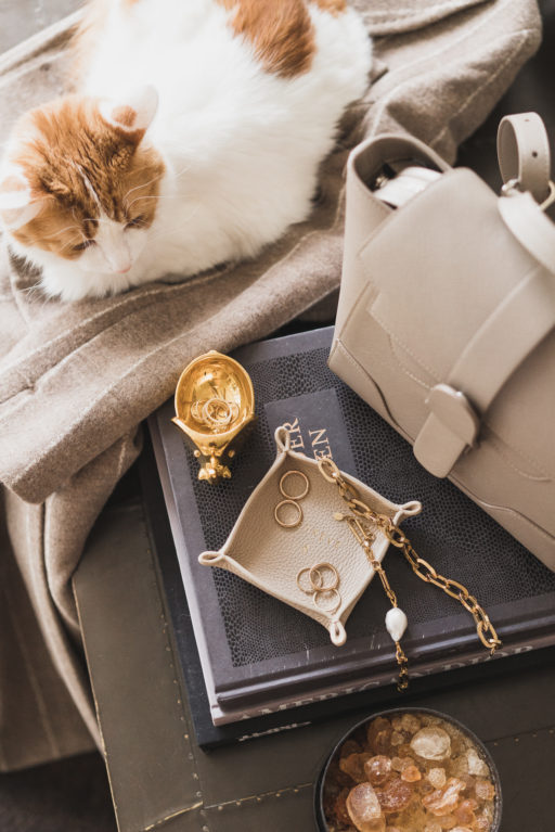 My fondness for taupe also extends to home pieces. I was thrilled to see that Senreve expanded their offerings to home decor. After moving earlier this year, I’ve kept an active eye out for chic and beautiful pieces that can add life to my apartment. This leather jewelry tray is just so fun! Great as an accent piece next to your door for keys or as an everyday item next to your nightstand or vanity for rings and bracelets. They also have incredible cashmere blankets! As you can see, I’m not the only fan of them. My kitty, Sam, is like a magnet to it! Everywhere it goes, he follows. It’s soft, warm, and the two-tone color block (mine is marigold on one side and off-white on the other) makes it easy to decorate depending on season and mood.