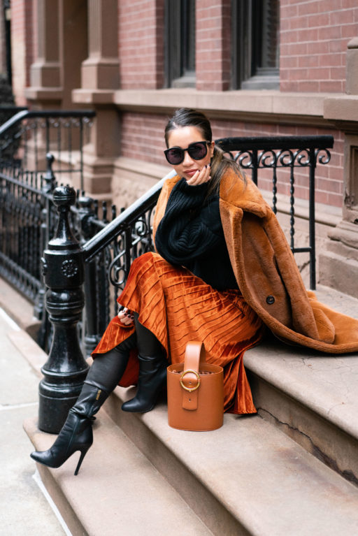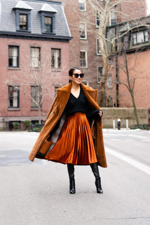 Coat – Avec Les Filles faux fur coat | Sweater – similar Caslon v-neck sweater | Skirt – A.L.C. copper pleated skirt | Boots – similar SARTO over-the-knee boots