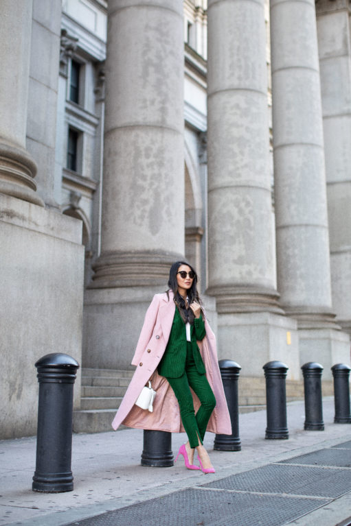 Suit – similar Boden green suit blazer & suit pants | Coat – similar J.Crew pink coat | Shoes – similar Stuart Weitzman pink suede pumps