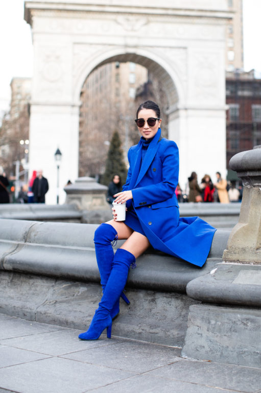 In my mind, blue is basically a neutral color. Outside of denim blue, I love jewel tone blues such as sapphire and cobalt. These colors are grounded in depth and so incredibly chic. There’s a quiet level of sophistication to them that’s hard to describe. If you love jewel tone blue, I’d recommend starting out with a statement blue coat (this one is a beautiful textured blue coat, under $175), and layer similar shades of blue to build a tonal monochromatic look.