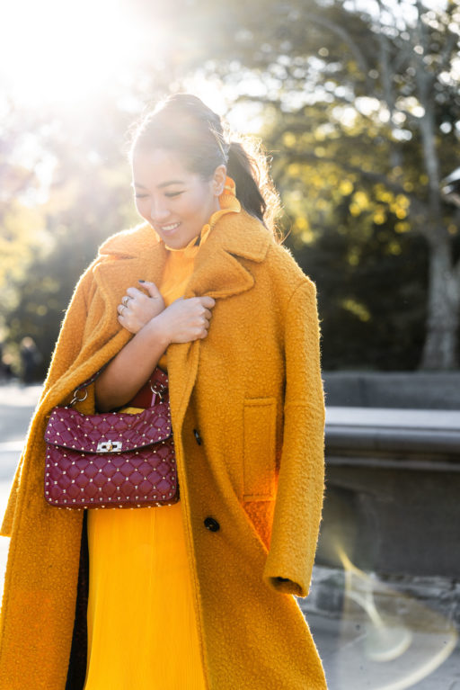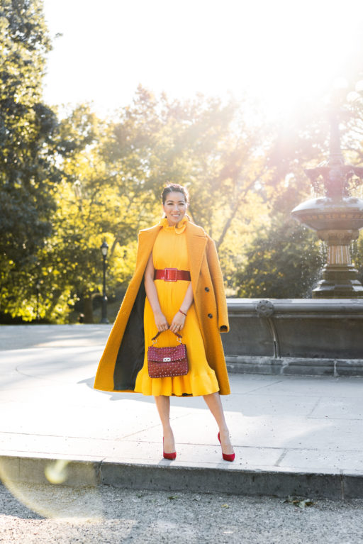 Coat – similar Pinko yellow coat | Dress – Tibi asymmetrical dress | Shoes – similar Schutz red pumps | Bag – Valentino Rockstud bag