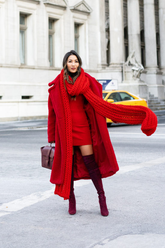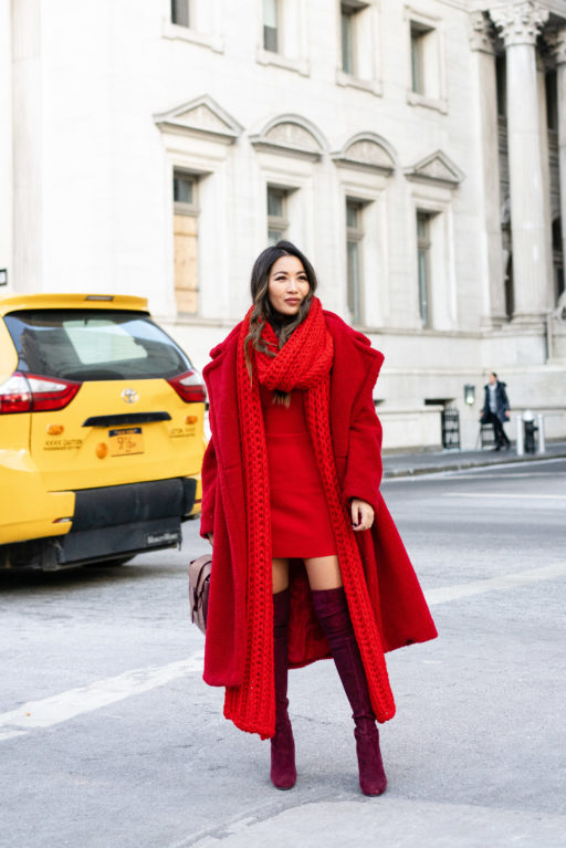 Coat – similar Lauren Ralph Lauren red coat | Dress – similar Loft red sweater dress | Bag – Senreve bag | Boots – Stuart Weitzman red boots | Scarf – similar Bloomingdales red scarf