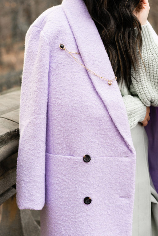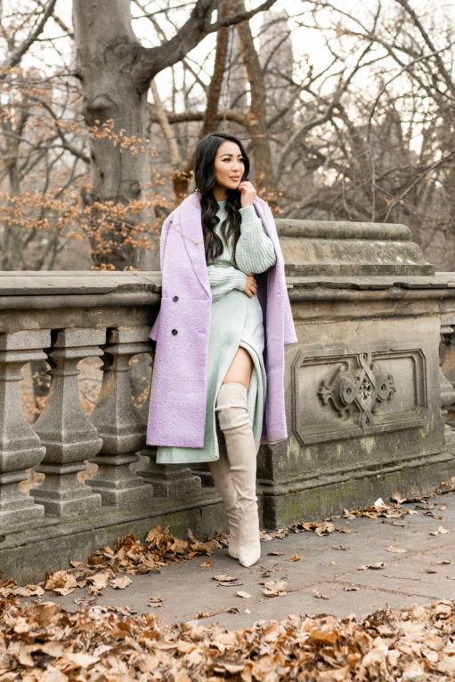 Coat – Ann Taylor lavender cocoon coat | Sweater – Ann Taylor balloon sleeve sweater | Skirt – Ann Taylor faux suede midi skirt | Shoes – more boot options: Marc Fisher knee high boots, Charles David beige boots, Aquazzura beige suede tall boots