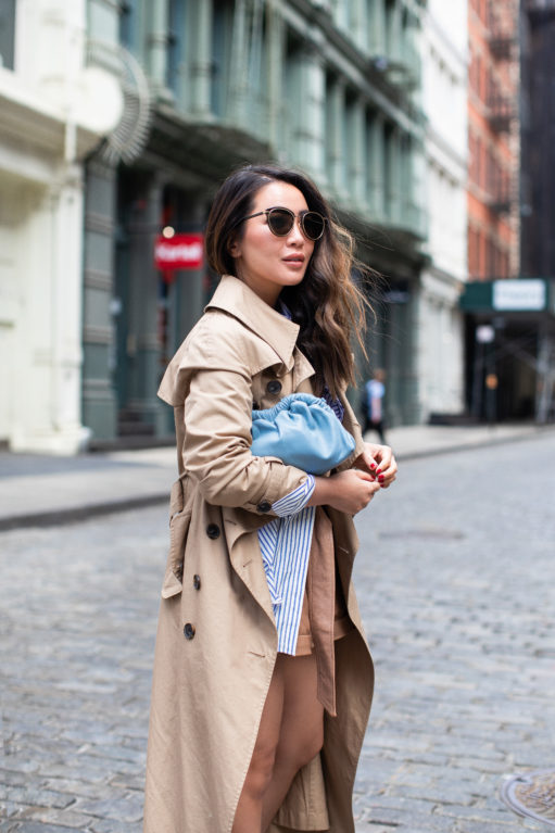 A tonal mix of beige + sky blue. Pairing my trench coat (also like this Club Monaco trench, on sale 70% off right now!) with my sky blue bag and light blue mules (extremely comfortable, under $50). This color pairing is so soft and chic!