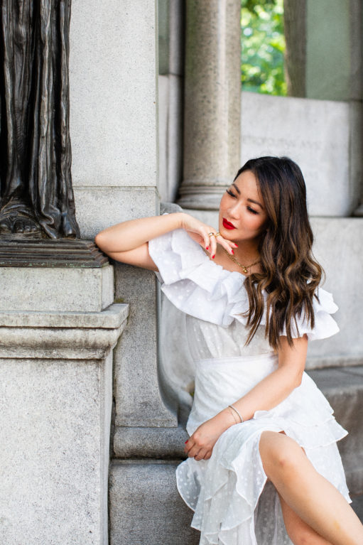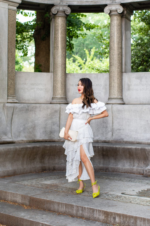 These are actually separates, which I think makes this ensemble more fun.  An off-the-shoulder ruffle top coupled with a hem slit skirt.  Worn as individual pieces, this top pairs beautifully with high rise jeans and this skirt works well with a bow tank top.  All beautiful pairings for summer days and nights.