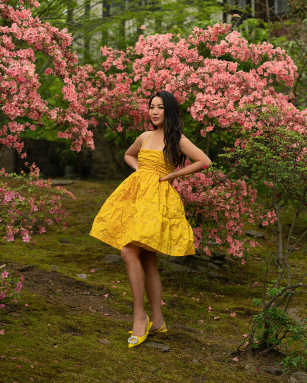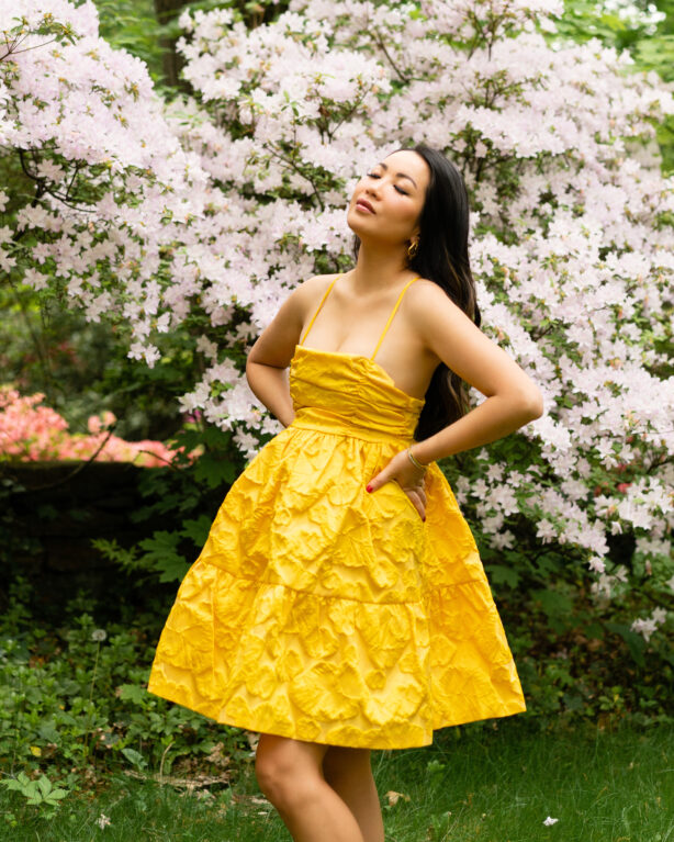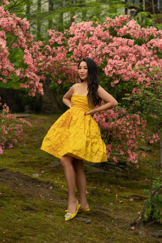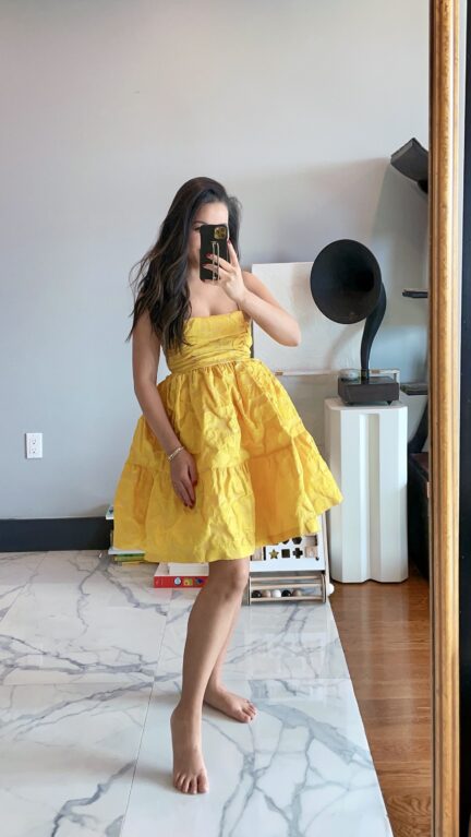 Let’s start with this Sezane Charlie dress.  It’s stunning!  The shape is sculptural and flattering, the color is vibrant while the texture is subtle and thoughtful.  It comes with adjustable straps so making the neckline and gathered chest band (basically the top portion of the dress) fit and adjusted correctly is not a problem.  I’m 5 ft 110 pounds and wearing a size 2 – the dress hits 2 to 3 inches above my knees.  No need for tailoring or alterations with this piece.  Also comes in a beautiful ivory and navy color.