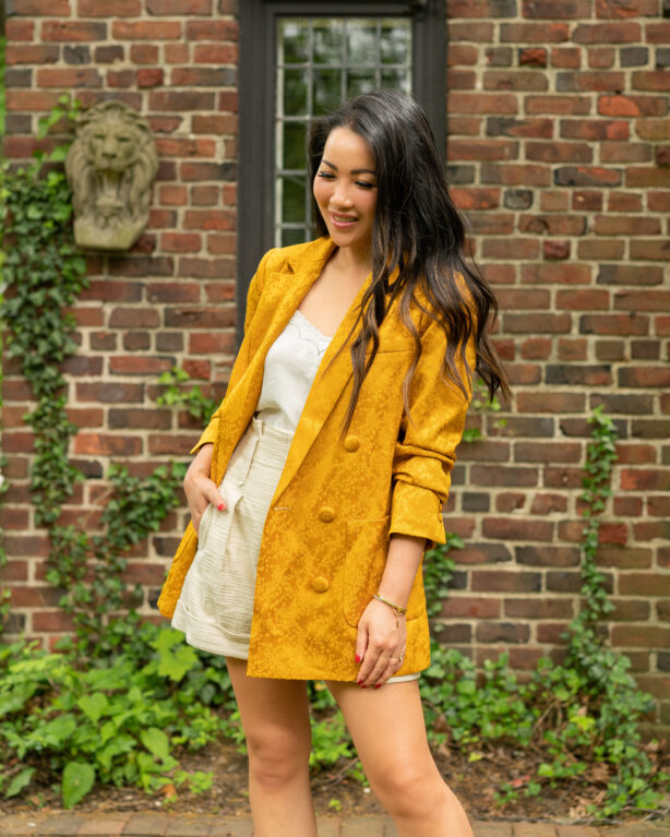 Now to the Sezane Agnes blazer.  It’s so soft!  Insanely lush and comfortable, it feels like you’re wearing sophisticated PJs for daytime.  I patiently waited for the matching pants to come back and just snatched a pair.  As for sizing, I’m wearing a size 2 and it fits well.  The shoulders and waist fit comfortably across.  The only small change I’d make is the sleeves.  They’re a tad long.  For now, I’m using the hair ties hack (basically use hair ties to roll up the sleeves for them to stay in place).  Other than that, no need for tailoring or alterations with this piece either.  Also comes in a gorgeous green shade.