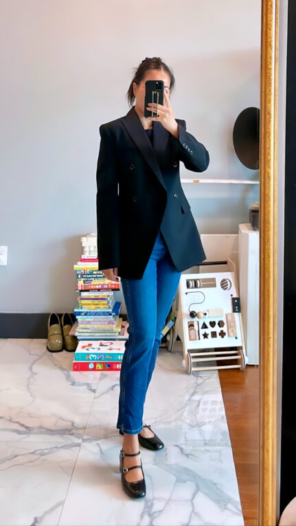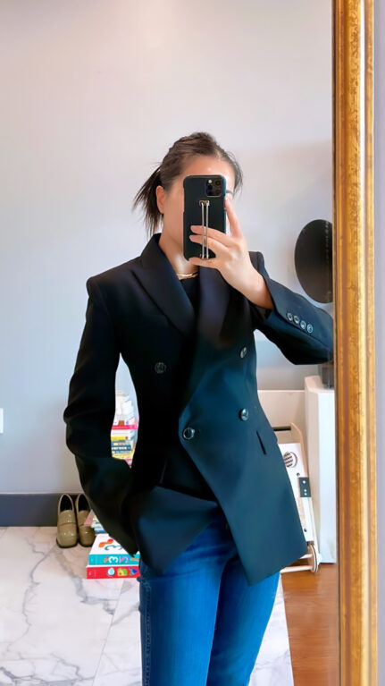 On another note – just wanted to share this double breasted suit blazer again, casually styled with jeans.  It’s beautiful in person!  Structured, tailored and looks so sleek and polished.  For sizing reference, I’m 5 ft 105 pounds and wearing a size XS (no alterations needed on the blazer).